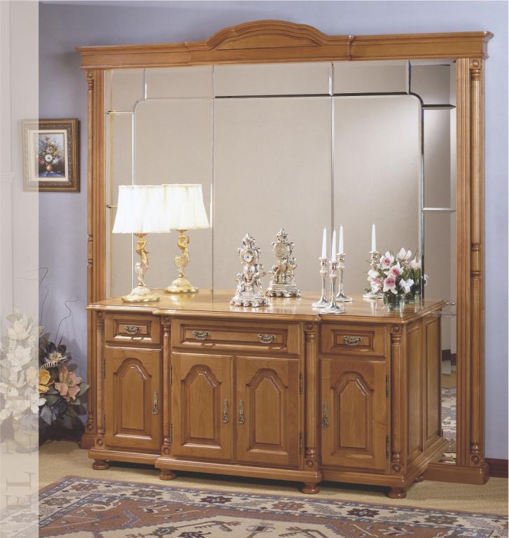Aparador con mural biselado fabricado en madera de castaño macizo. Medida del aparador 175 cm. Medidas de mural 235 x 235 alto. Barnizado en color avellana glaseado.