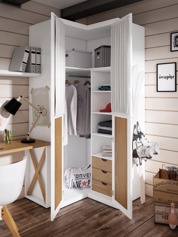Fabricados en chapa de madera de roble barnizada, combinada con piezas lacadas; compuesta por una cama compacto de 90x190. Estantería al suelo combinando huecos abiertos con huecos cerrados con puertas.