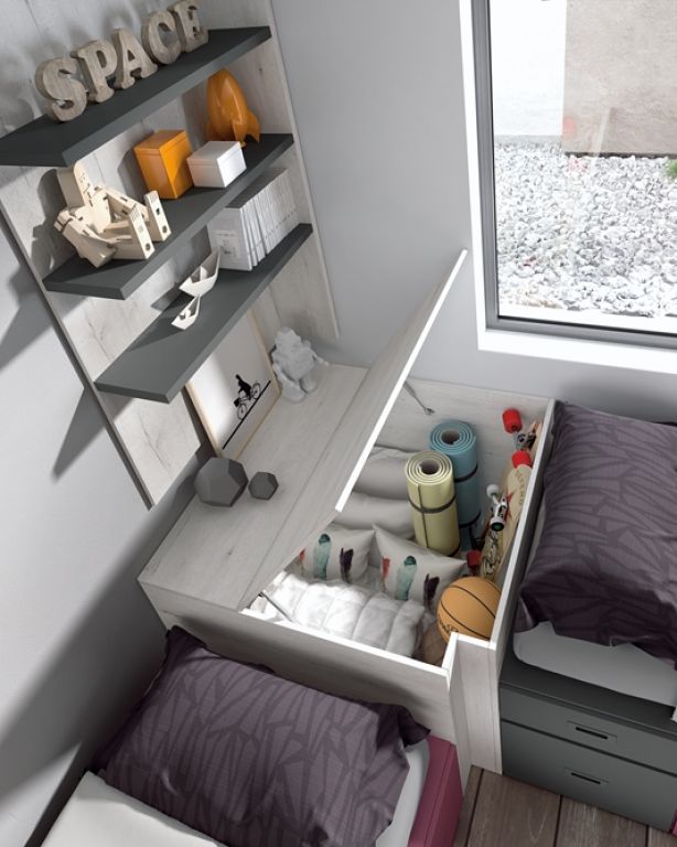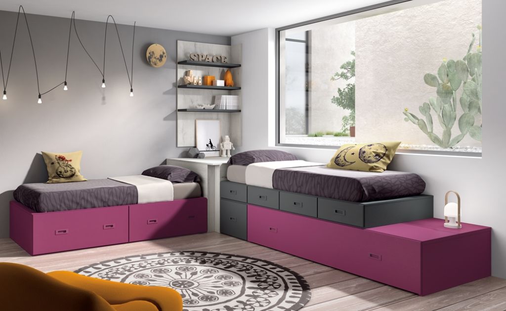 El dormitorio está acabado en melamina base Mozart, combinando módulos en Arándano y Teide. 2 camas de 90x190 montadas sobre módulos cube 1 cajón.