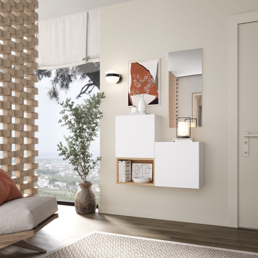 Recibidor en tablero de melamina color blanca lisa combinada con cajetin en Artisán..