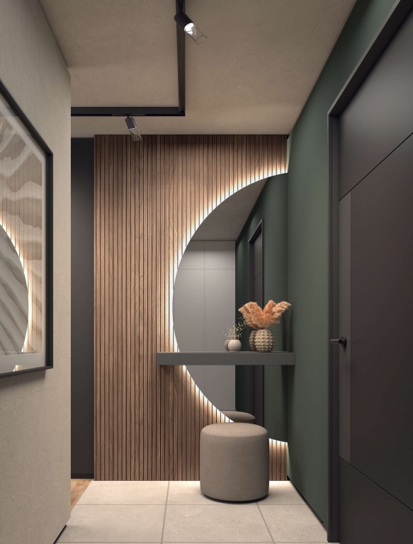 Recibidor panel tablerofranjas dando una sensacion alistonada.